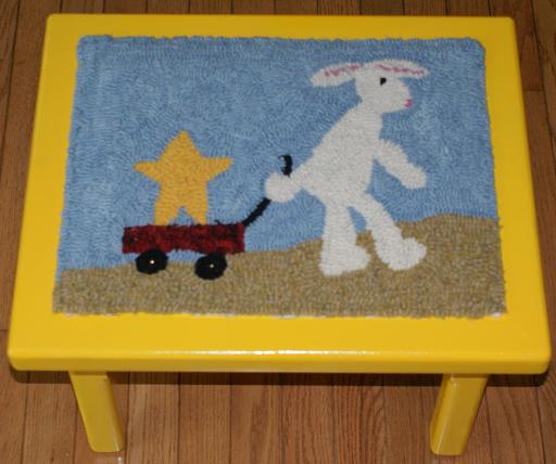 Title - Bunny With a Wagon Bench Topper Designer - Julie Burns Hooked by - Arleen Carlson